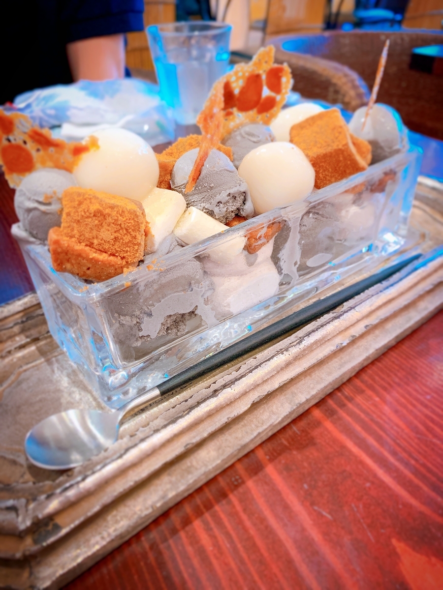白玉、わらび餅、黒胡麻アイスのパフェ。